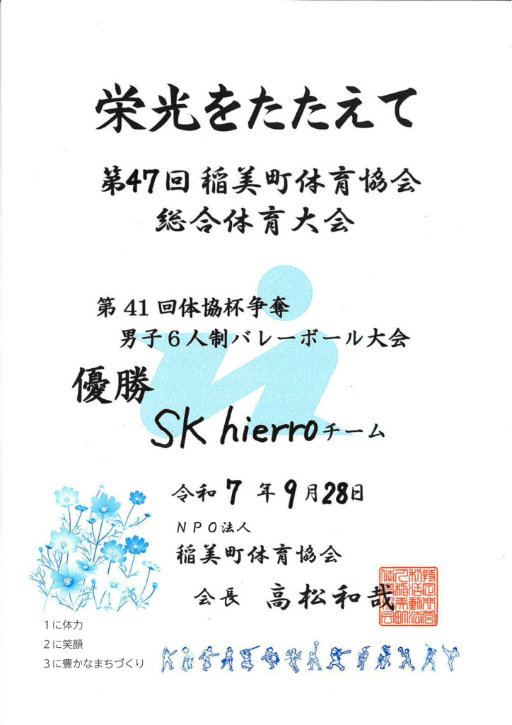 2025.10.10 お知らせ SK hierro大会優勝のお知らせ この度、当社のバレーボールチームであるSK hierroが2025年9月28日(日)に行われた 第47回稲美町体育協会総合体育大会 第41回体協杯争奪 男子6人制バレーボール大会において、見事優勝いたしました。 日頃より応援いただいている皆様のお力添えに心より感謝申し上げます。 今後もチーム一丸となって、更なる高みを目指してまいります。 引き続き、SK hierroへの温かいご声援をよろしくお願いいたします。